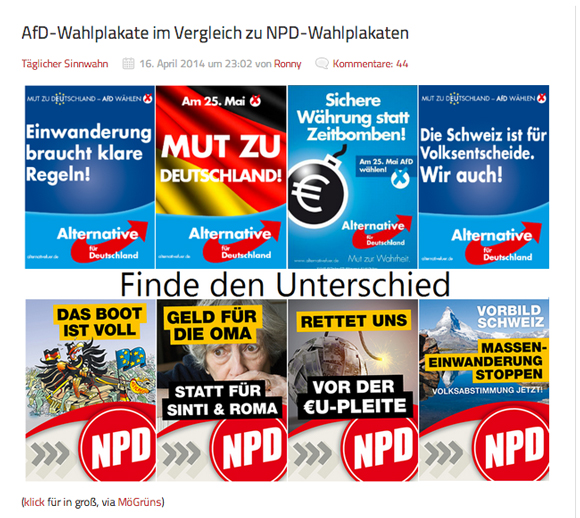 The AfD tries to distant itself from the neo-Nazi NPD, but as far as I can see, they both swim in the same brown swamp.