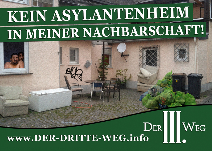 The neo-Nazi organization Der dritte Weg ("The Third Way") celebrates the arson attack on a group home for refugees with the headline:  Nach Brandanschlag bleibt Tröglitz asylantenfrei ("Tröglitz remains free of asylum-seekers following an arson attack.").