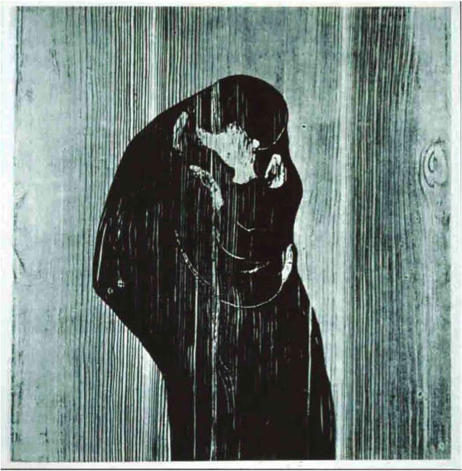 I was walking along the road with two friends – the sun was setting – suddenly the sky turned blood red – I paused, feeling exhausted, and leaned on the fence – there was blood and tongues of fire above the blue-black fjord and the city – my friends walked on, and I stood there trembling with anxiety – and I sensed an infinite scream passing through nature.