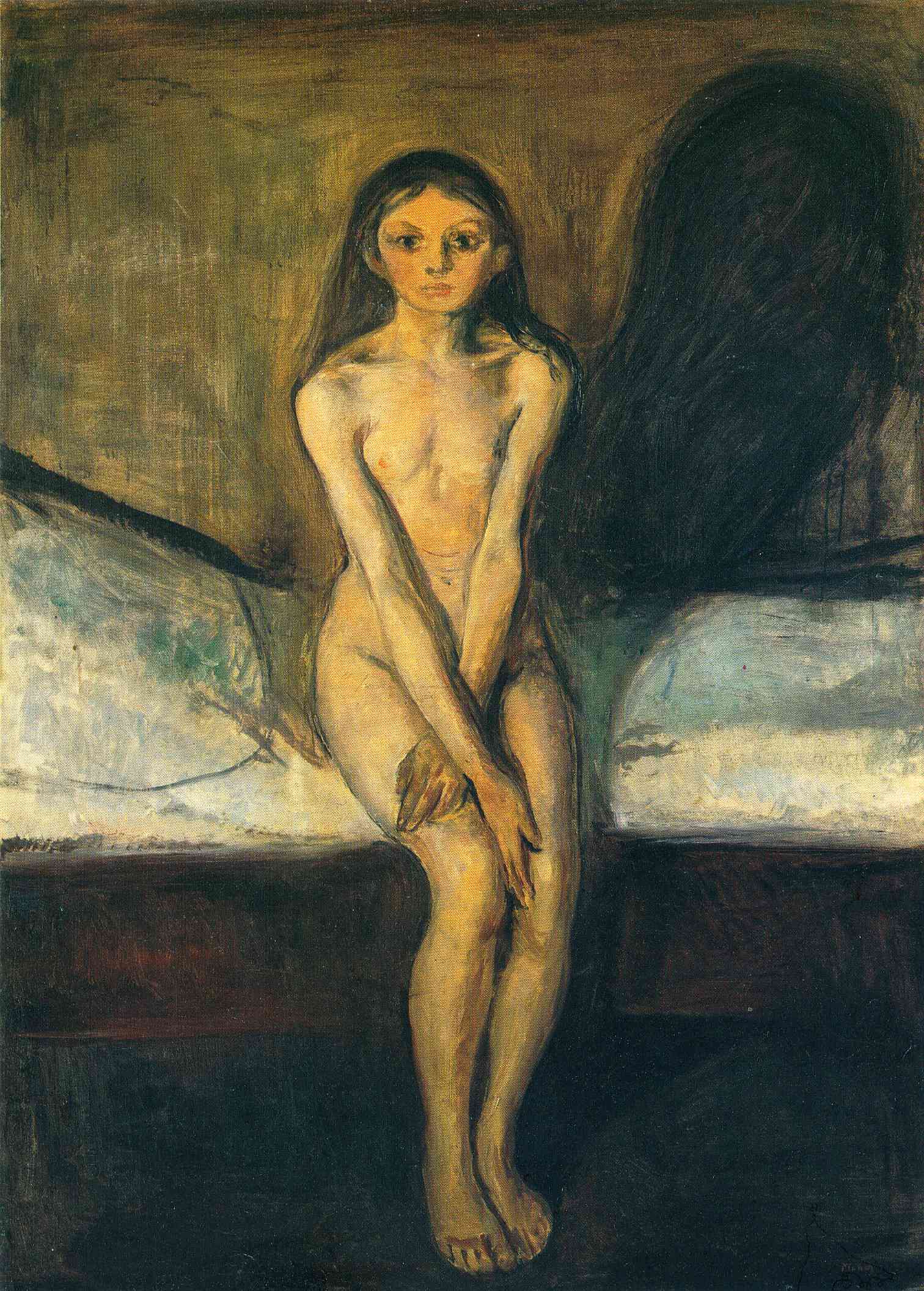 My personal favorite Munch painting displayed at this exhibit is Puberty (1895).  Here a wide-eyed pubescent girl is sitting on the edge of a bed staring with a somewhat frightened or startled gaze at the viewer, her arms folded modestly to cover the pubic area.  The light pours in from the left side of the painting, creating an ominous shadow which symbolizes her awakening sexuality.  The painting brings to mind Frank Wedekind's drama Frühlings Erwachen – written approximately the same time.