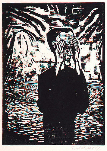 The most striking derivative work displayed in the Scream room is Erich Heckel's 1917 woodcut Mann in der Ebene (Selbstbildnis). Here the pulsating lines emanating from the head of the artist as he contemplates the horrors of war echo Munch's blood-red waves of sky..