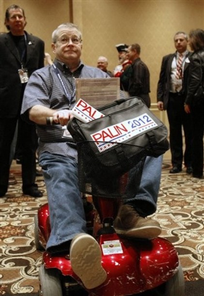 Scanning the thousands of hopped-up faces in the crowd, I am immediately struck by two things. One is that there isn't a single black person here. The other is the truly awesome quantity of medical hardware: Seemingly every third person in the place is sucking oxygen from a tank or propping their giant atrophied glutes on motorized wheelchair-scooters. As Palin launches into her Ronald Reagan impression — "Government's not the solution! Government's the problem!" — the person sitting next to me leans over and explains.