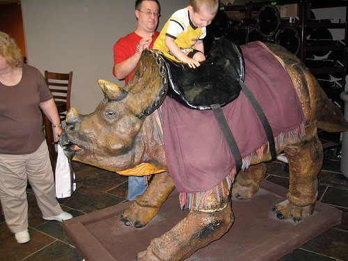 A young family helps their child ride a Triceratop dinosaur at the newly opened Creation Museum, just like Adam and Eve did 6,000 years ago.
