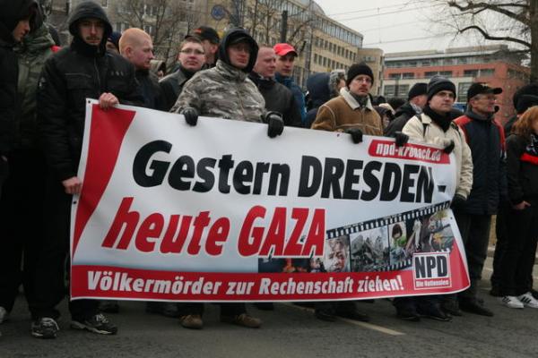 How ironic that neo-Nazis are coming together with Muslim extremists to make common cause.  Usually, the NPD describes the Muslims in Germany as an alien bacillus, infecting the pure German Volk.  But when it comes to vocally hating Jews, Muslims and neo-Nazis are bosom-buddies.