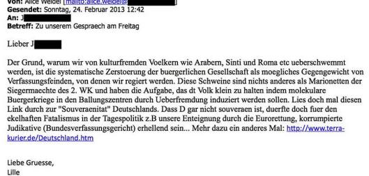 But this "moderate" image of Alice Weidel has been shaken by the discovery of a 2013 email, sent by "Alice Weidel" to a small group of friends: