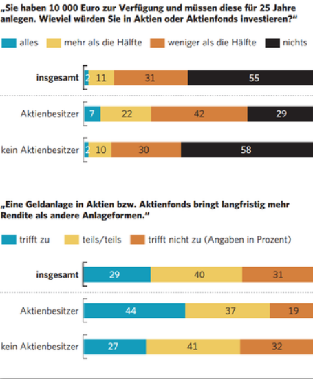 A recent survey shows how risk-adverse German investors are.  A representative sample were asked what they would do with 10,000 Euros for a 25-year time frame.  Only 13% would put all or more than half of the amount in stocks. A majority would not invest in stock at all.